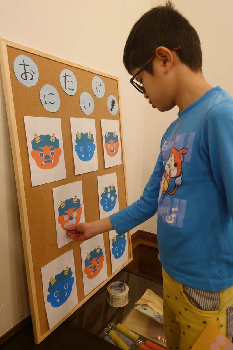 赤と青の鬼の顔に、シールを豆として貼っていってどれだけ沢山鬼の顔を